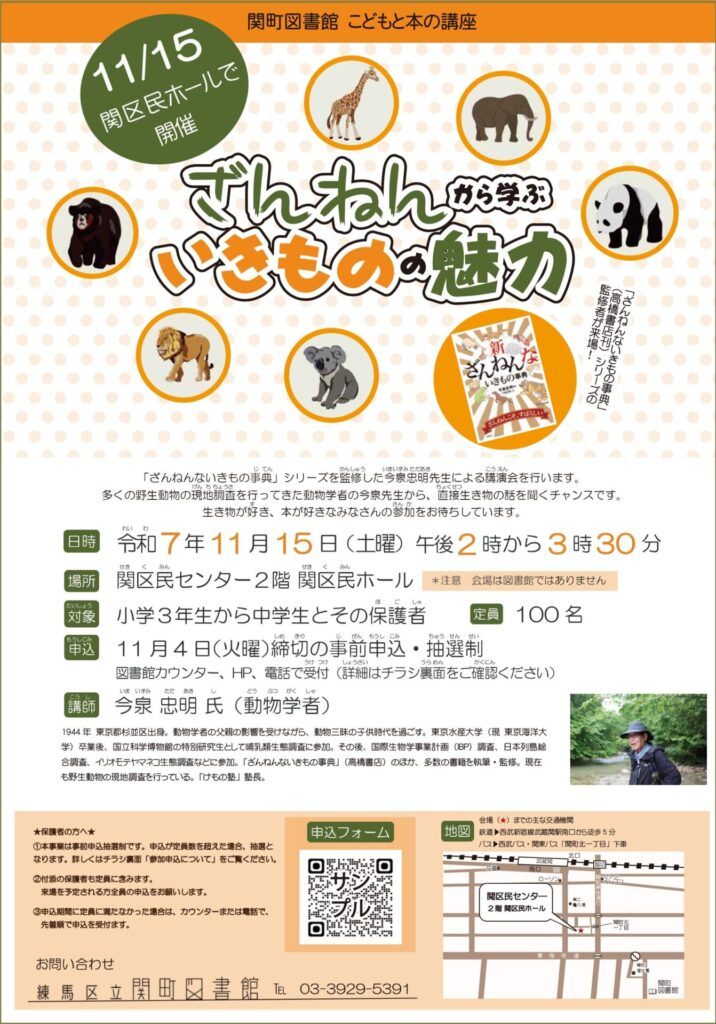 11月15日(土曜日)に練馬区立関町図書館による「こどもと本の講座」で、今泉先生が「ざんねんから学ぶいきものの魅力」をテーマにしたお話をします。会場は、関町区民センターの2階にある関区民ホールです。(関町図書館ではないので、お間違いなく!)